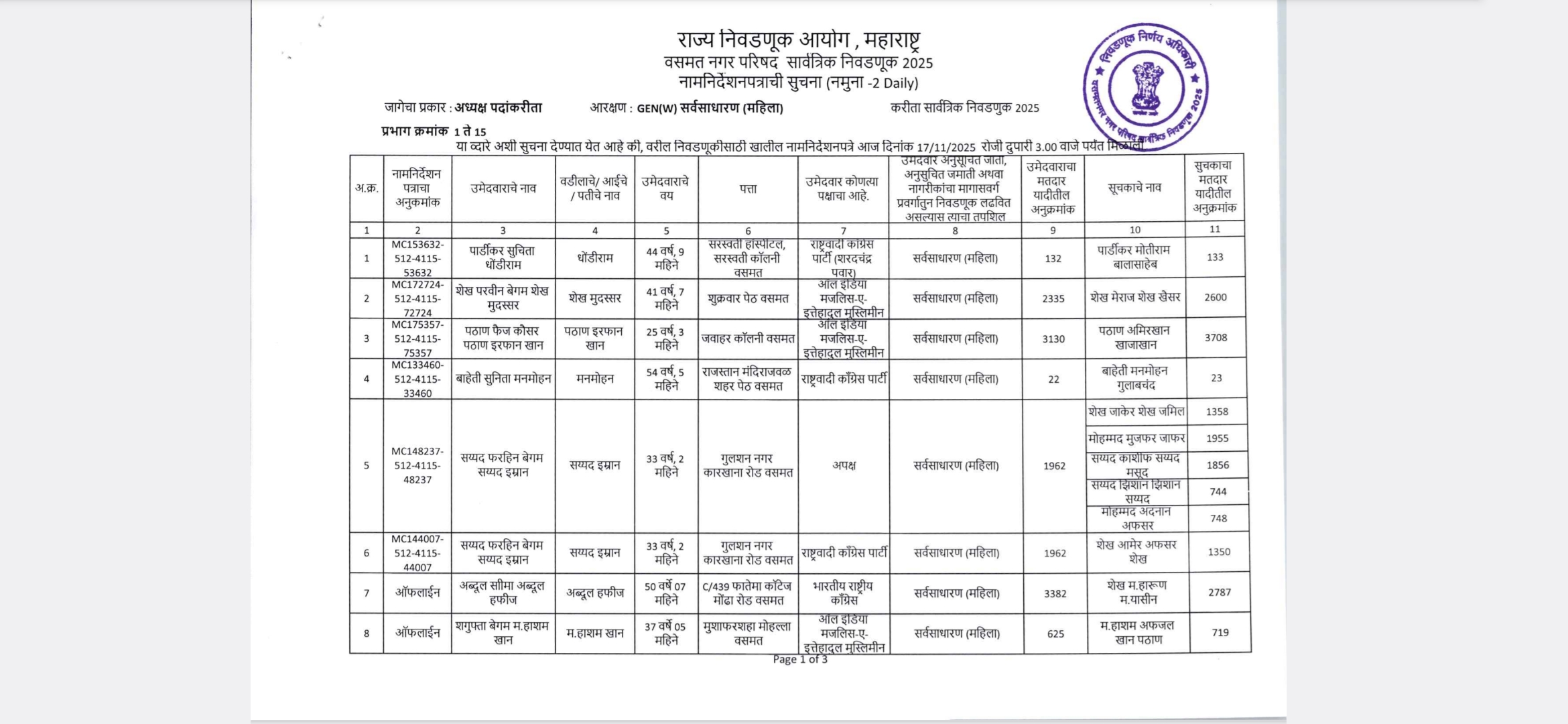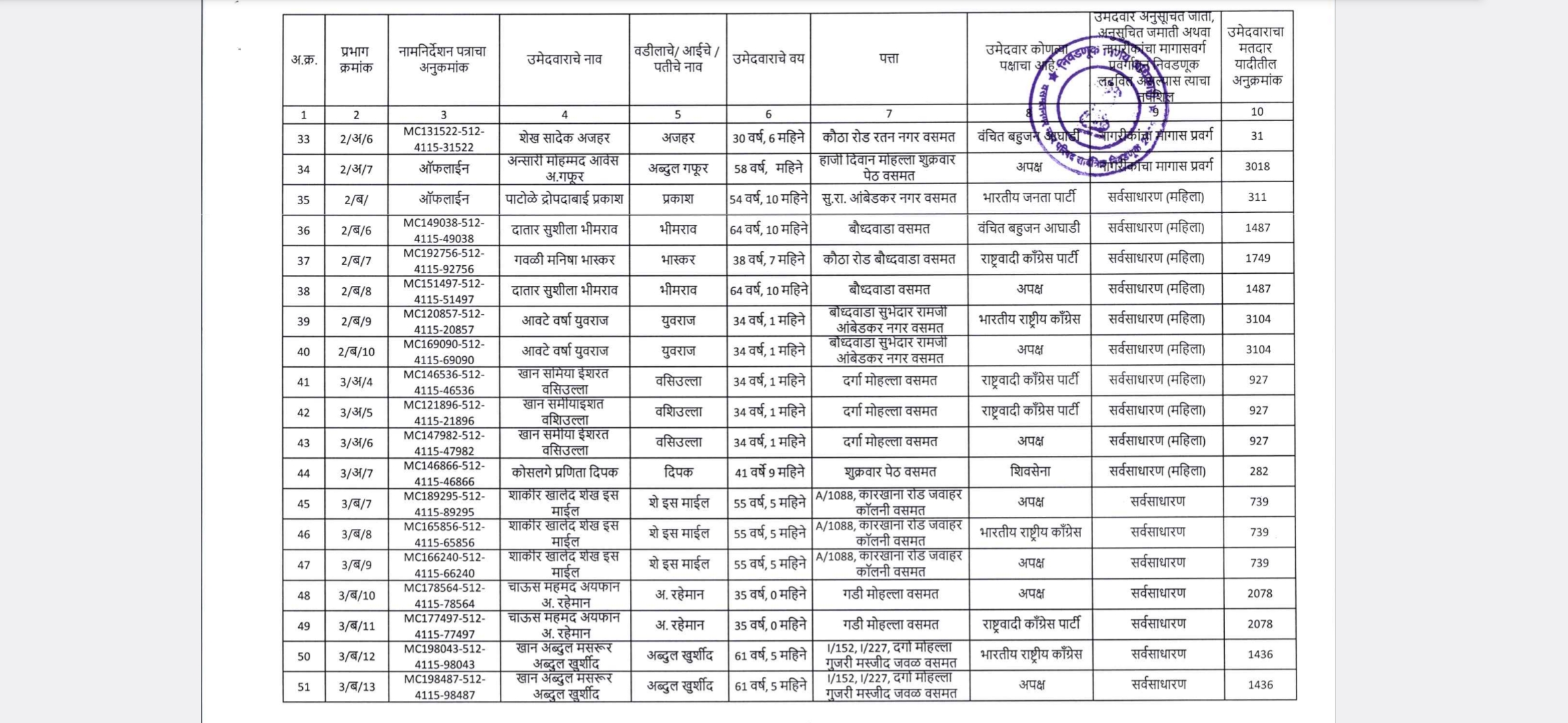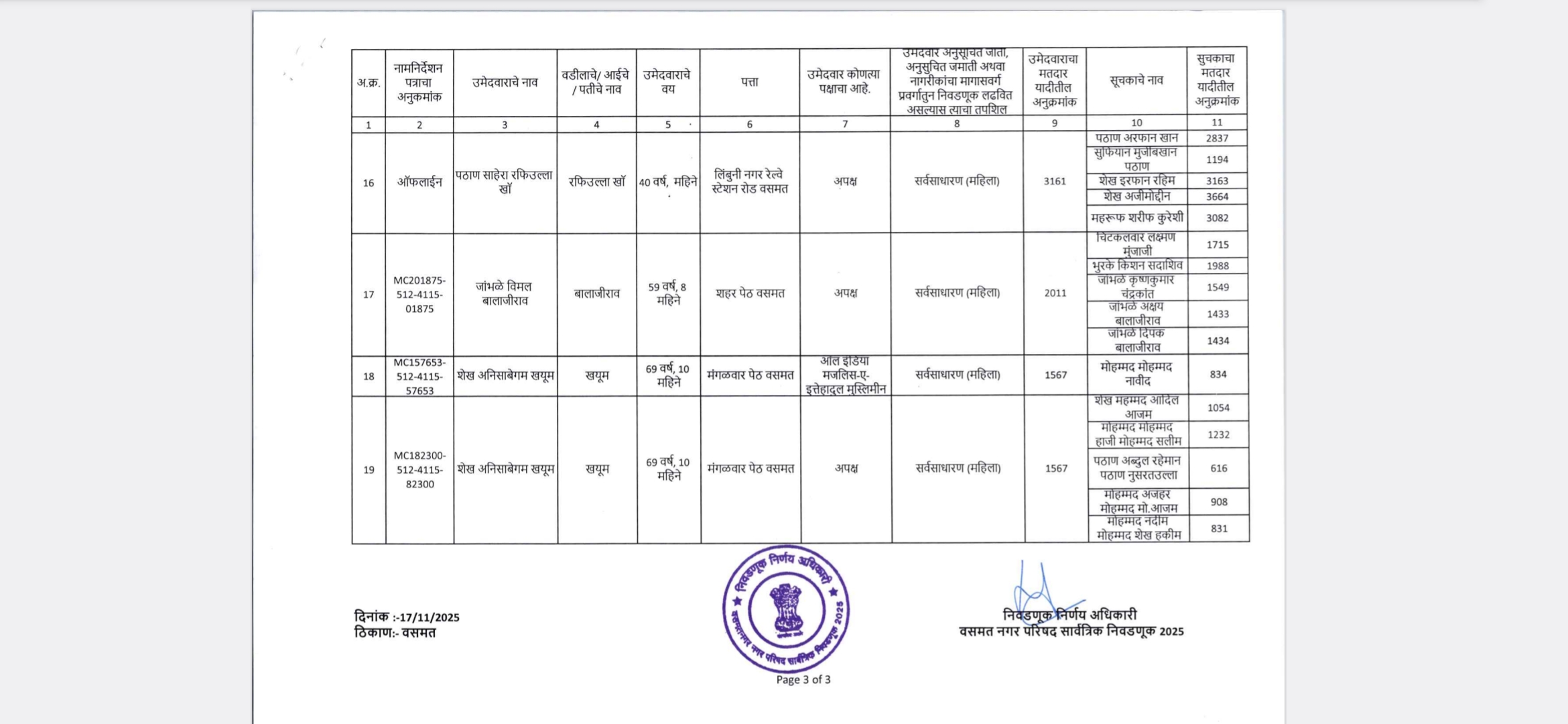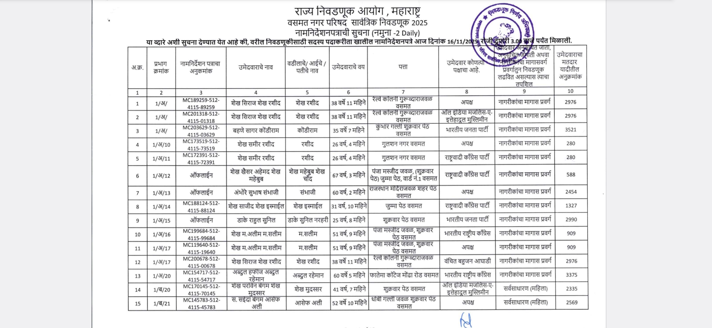 वसमत नगर परिषद निवडणूक आजचे प्राप्त उमेदवारी अर्ज